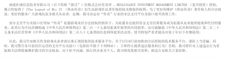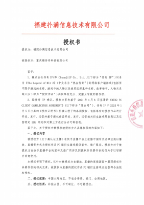 福建撲滿信息技術(shù)有限公司注冊(cè)地位于福建省福州市,是國(guó)內(nèi)《熱血傳奇》客戶端游戲獨(dú)占性版權(quán)人。對(duì)《熱血傳奇》客戶端游戲擁有全部版權(quán),并有權(quán)基于版權(quán)權(quán)利進(jìn)行該游戲維權(quán)。株式會(huì)社傳奇IP (以下簡(jiǎn)稱傳奇IP )對(duì)《The Legend of Mir 2》(中文名為“熱血傳奇"、或“傳奇”、“傳奇2”、“MIR II”)游戲(以下稱為 “授權(quán)作品”) 共同享有充分、完整且有效的著作權(quán)。經(jīng)傳奇IP授權(quán) , RENAISSANCE INVESTMENT MANAGEMENT LIMITED (以下簡(jiǎn)稱 RENAISSANCE Ltd.)有權(quán)在中國(guó)大陸地區(qū)獨(dú)占性地對(duì)授權(quán)作品的網(wǎng)絡(luò)客戶端游戲進(jìn)行開(kāi)發(fā)、 發(fā)行、管理、宣傳、推廣和運(yùn)營(yíng),針對(duì)授權(quán)作品的侵權(quán)游戲及侵權(quán)方,RENAISSANCE Ltd.有權(quán)采取必要的措施,并有權(quán)將前述權(quán)利分授權(quán)給第三人。福建撲滿信息技術(shù)有限公司經(jīng)RENAISSANCE Ltd.授權(quán),獲得上述權(quán)利,有權(quán)在中國(guó)大陸地區(qū)獨(dú)占性地對(duì)授權(quán)作品的網(wǎng)絡(luò)客戶端游戲進(jìn)行開(kāi)發(fā)、發(fā)行、管理、宣傳、推廣和運(yùn)營(yíng),并有權(quán)對(duì)侵權(quán)行為/主體采取維權(quán)措施。